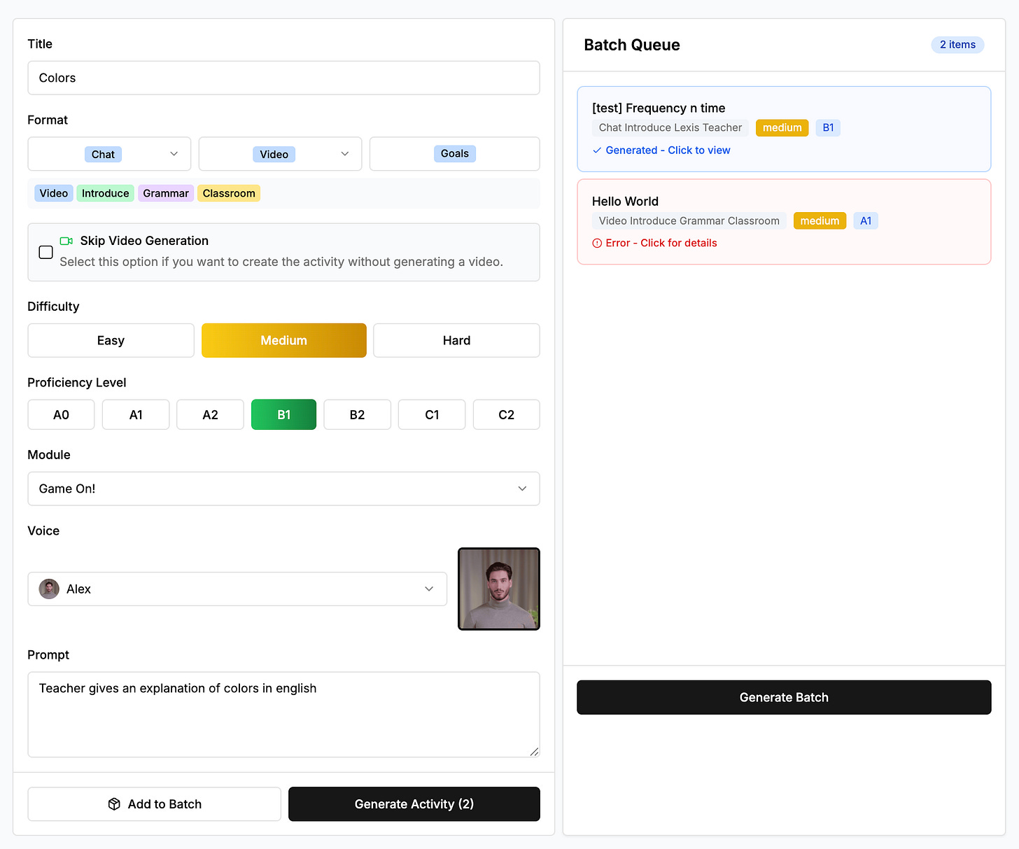 Walkthrough of our Activity Editor backoffice platform. This allows Language Learning Specialists to quickly generate activities and edit them, allowing our throughput to be greatly accelerated