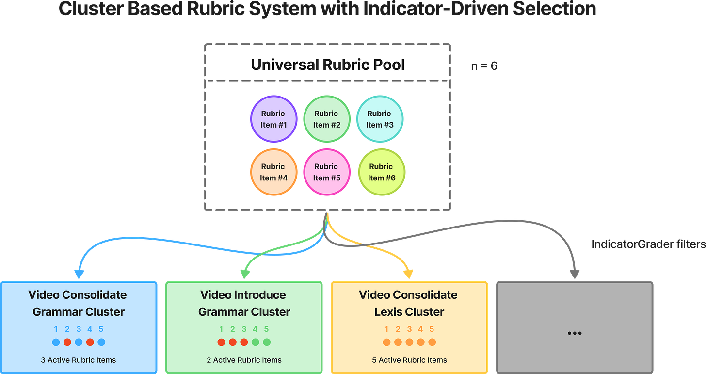 Yet we soon realized that our nine lesson formats posed a major challenge: each demanded its own evaluation logic. Our nine lesson formats presented a fundamental problem for reward design. A VideoIntroduceGrammar lesson requires assessment on scaffolding progression and concept clarity. A ChatTestPronunciation lesson requires phonetic targeting. A VideoConsolidateLexis lesson requires repetition patterns and contextual variety. And so on. These formats exist precisely because different learning objectives demand different instructional approaches.