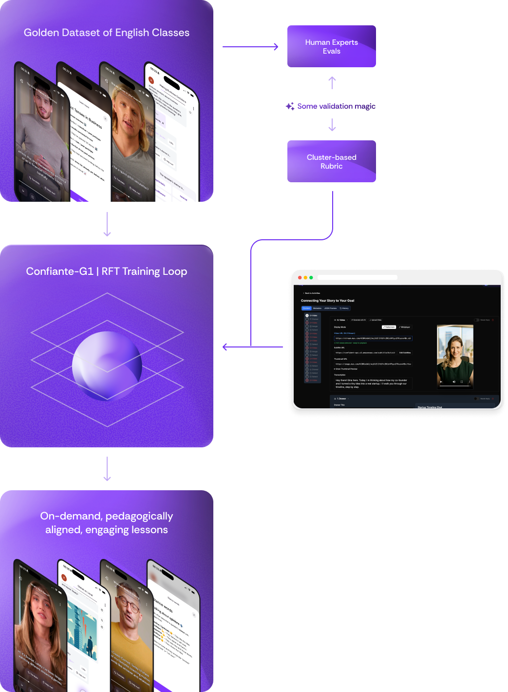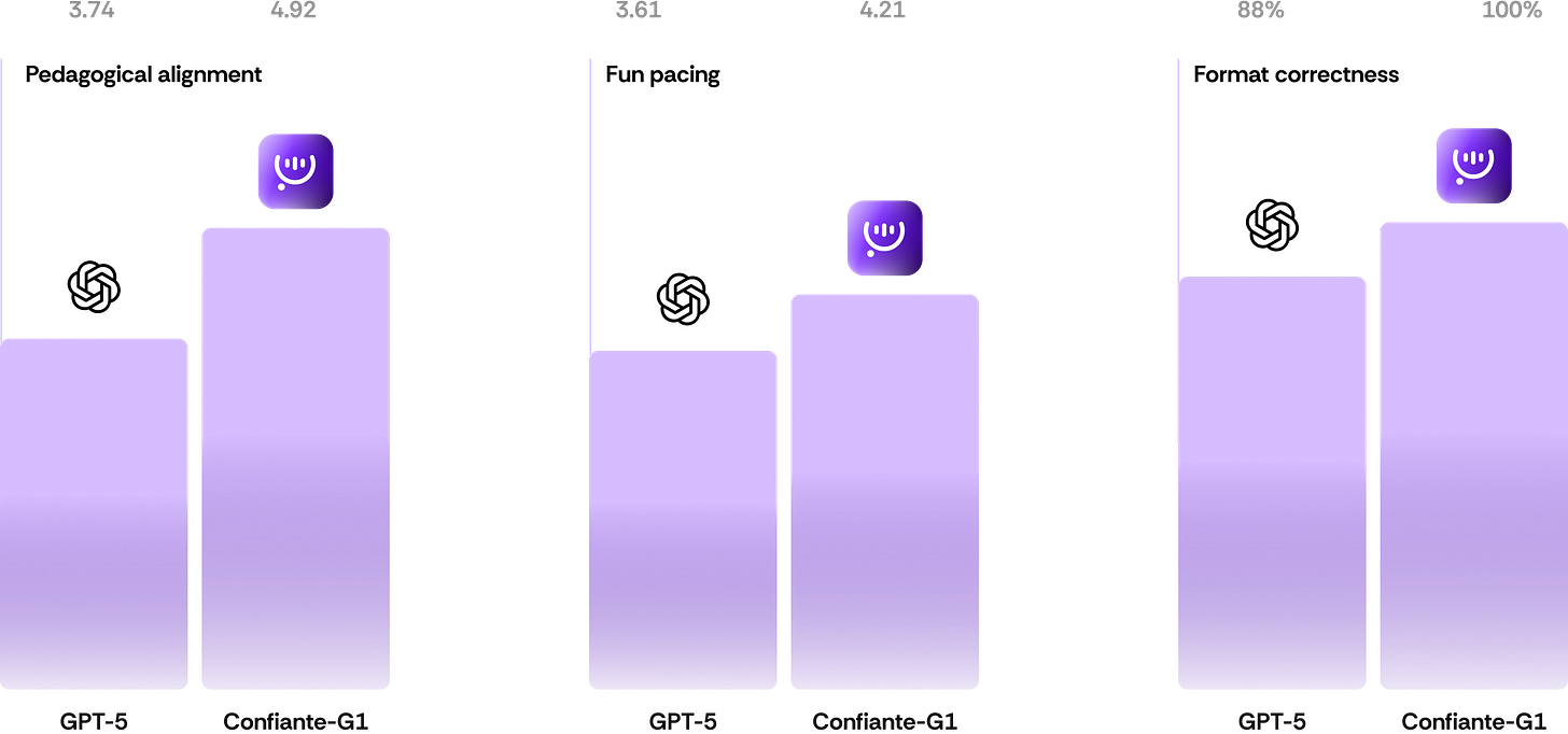 We created Confiante G1, a foundation model for English language instruction. By using reinforcement fine-tuning with a novel cluster-based rubric system, we achieved pedagogically sound lesson generation at scale. The model learned to optimize for underlying pedagogical principles rather than surface patterns, enabling it to generalize across the combinatorial space of proficiency levels, lesson formats, and learning contexts.