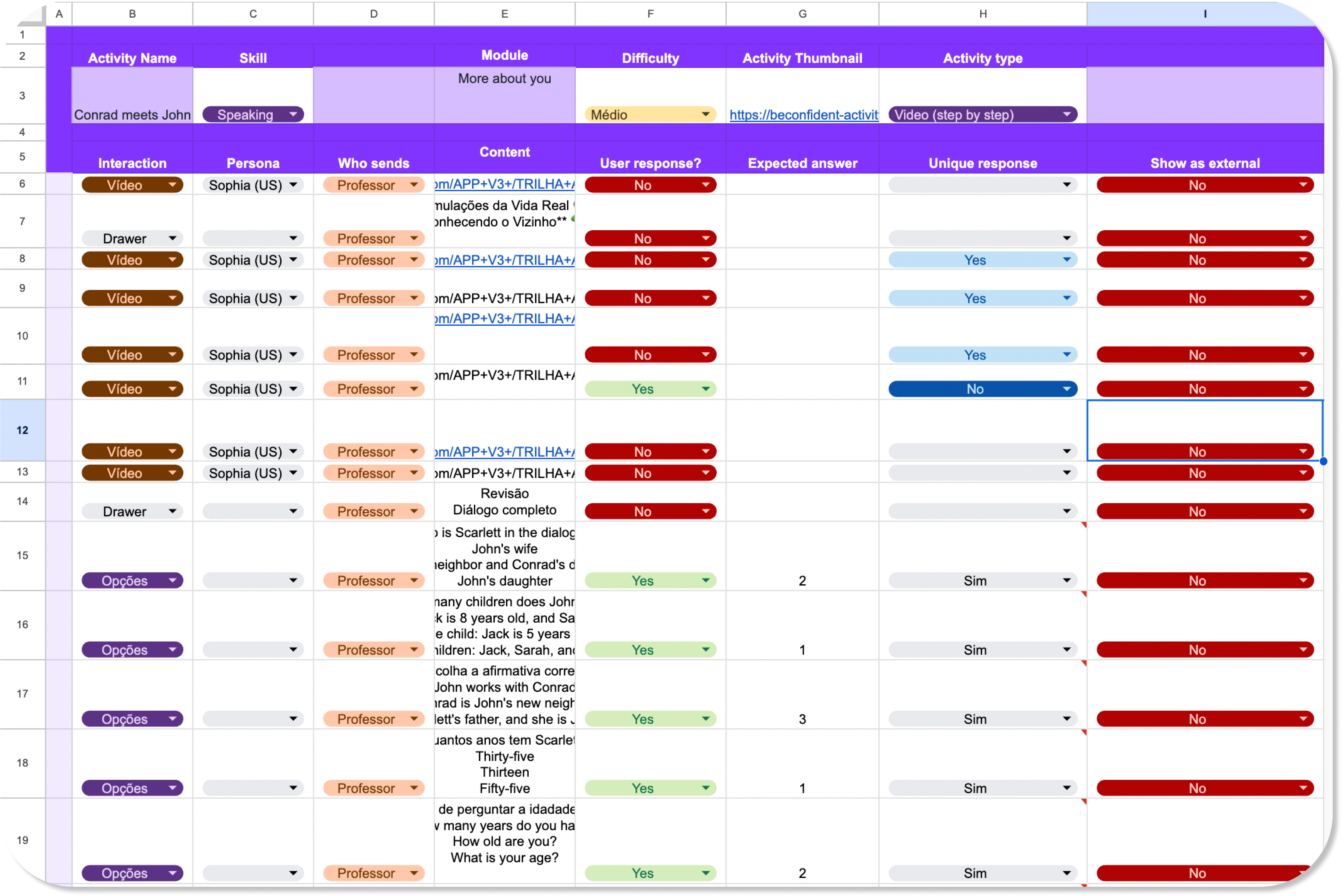 Language learning specialists crafted activities as explicit interaction programs in structured spreadsheets. Each row represented one interaction turn with fields specifying: interaction type (video, options, text input, audio), persona, content, user response requirements, expected answers, conditional logic, and display rules. A typical lesson comprised 30-50 such rows, essentially encoding the activity as a finite state machine with conditional transitions.