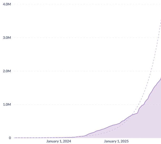 Cumulative user base of the BeConfident App, surpassing 1.8 million users by October 2025. The trajectory follows an exponential growth tendency.