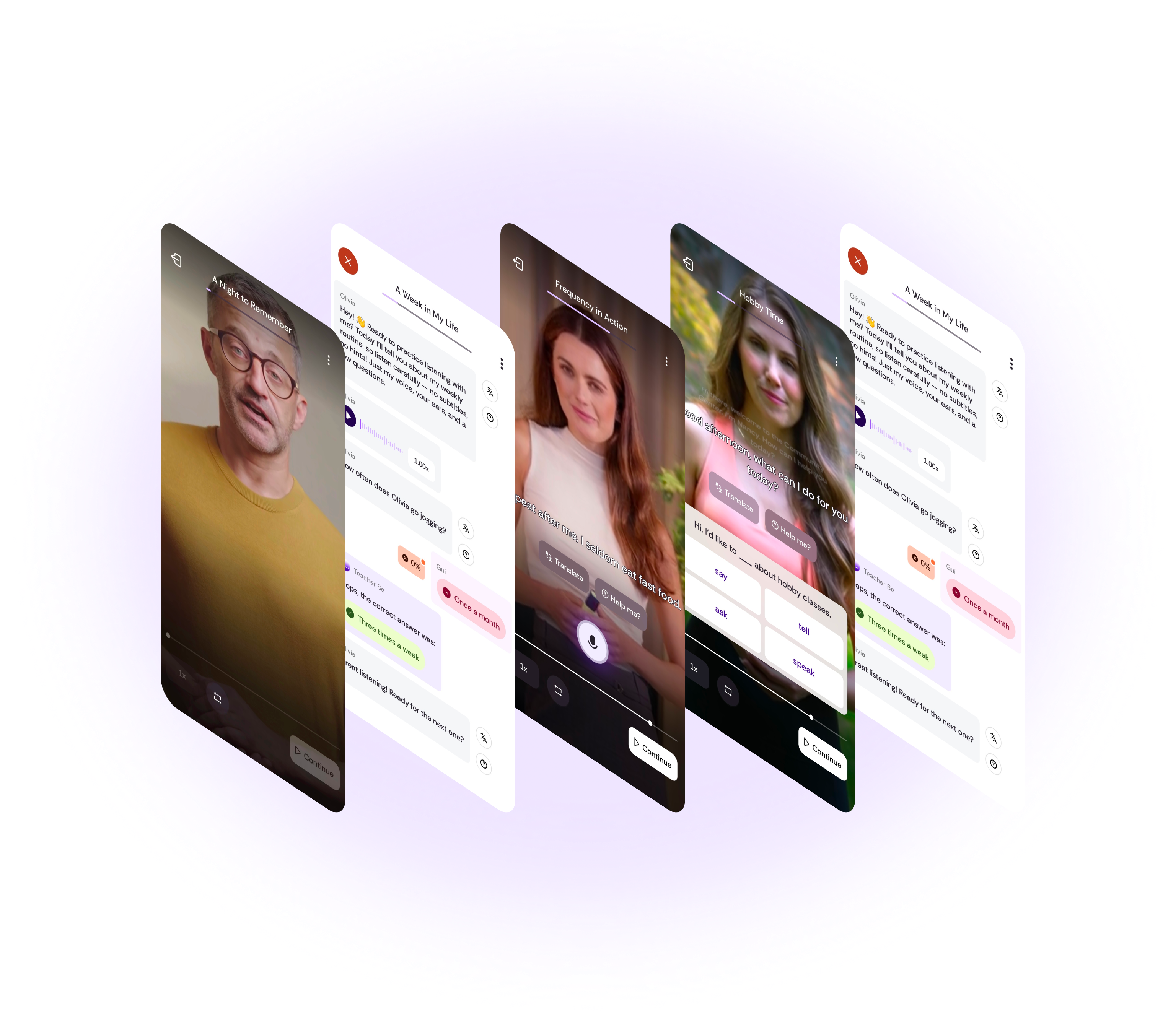 In the BeConfident App, productive skills are cultivated through real-time voice and text conversations with AI tutors, allowing learners to practice speaking naturally and receive immediate, personalized feedback. However, SLA research highlights that receptive skills are equally essential: they introduce new vocabulary, grammar, and contextual understanding that later fuel productive expression.