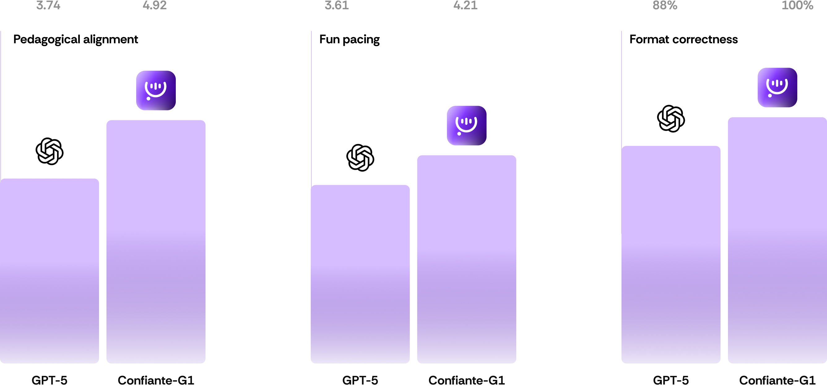 Evaluation of 20k English lessons across rubric clusters. The first two metrics report the average scores (Likert 1–5) for Pedagogical Alignment and Fun Pacing; the third reports Format Correctness as accuracy (%).
